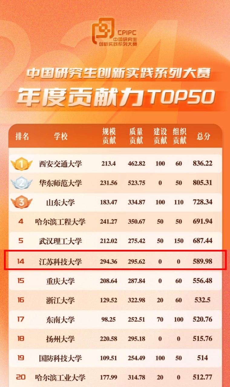 我校以总分589.98的成绩荣登研究生培养单位年度贡献力TOP50第14位(江苏第2位),获评2024年度“重要贡献单位”。