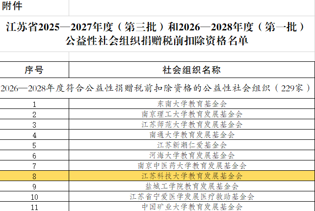 相关链接:关于江苏省2025—2027年度(第三批)和2026—2028年度(第一批)公益性社会组织捐赠税前扣除资格名单的公告