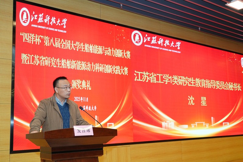 江苏省工学1类研究生教育指导委员会秘书长沈星围绕国家“双碳”战略和国际海事组织减排要求发言,指出大赛是培养船舶动力领域创新型人才的重要载体,有助于提升研究生的创新能力、团队协作能力和跨学科融合能力,希望参赛研究生把握机遇、持续精进,为我国船舶工业绿色低碳发展贡献力量。