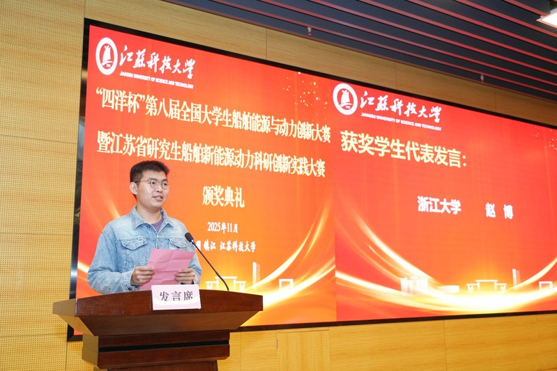 浙江大学赵博作为学生代表发言。他回顾了数月的备赛历程表示,大赛不仅检验了专业知识和技能,更是一次在实践中突破自我的宝贵经历。未来将继续深耕绿色能源与低碳技术研究,为绿色航运和清洁能源领域贡献力量。